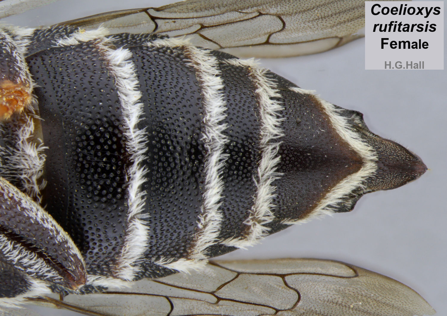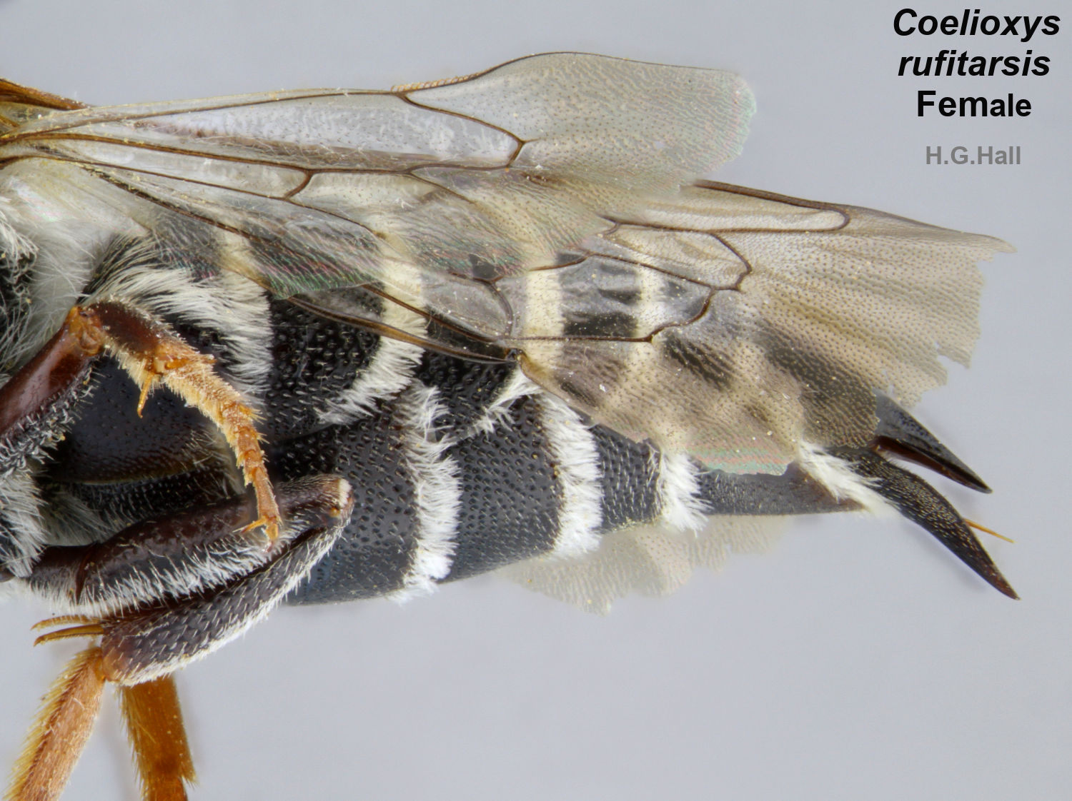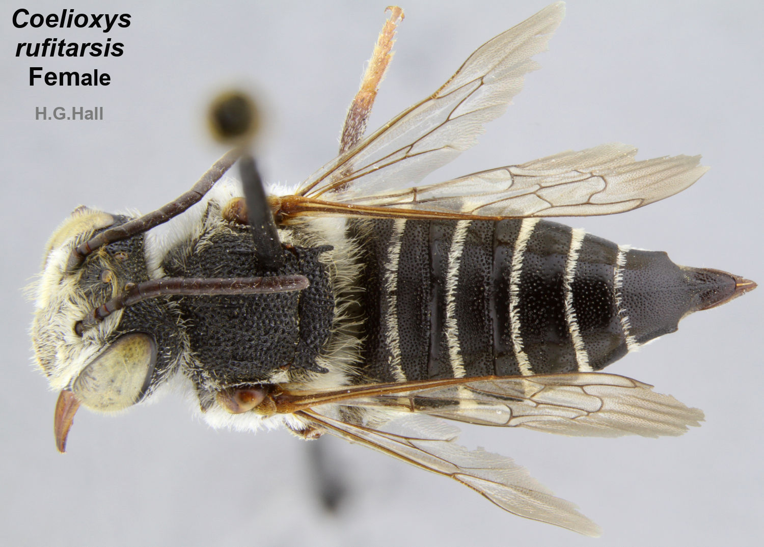 Fovea on metasomal tergum 2 wide, deep, short, conspicuous; margins of fovea impunctate; bee robust. .C. rufitarsis