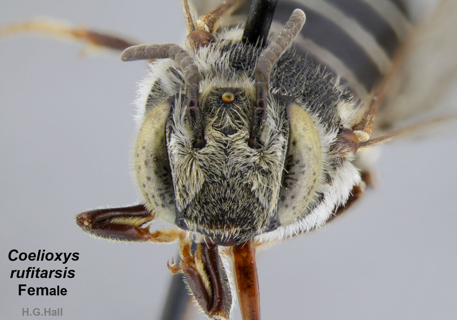Ocular hairs long (about 0.15mm); tergum 6 with tiny setae ventral to angles which have a velvety appearance; tergum one with median fascia of long, slender erect setae....C. rufitarsis