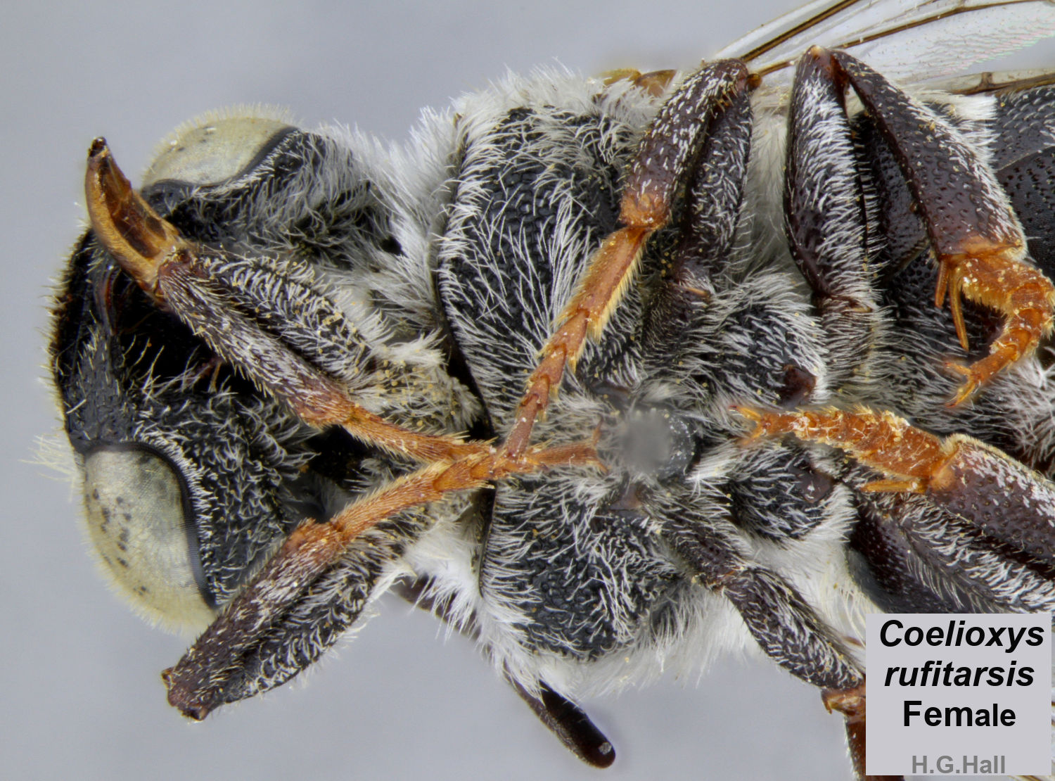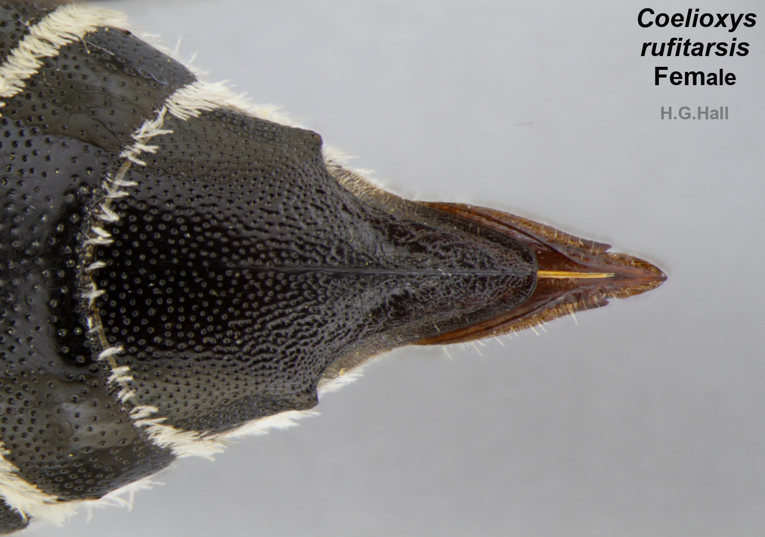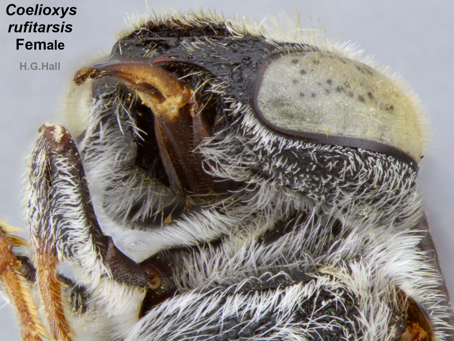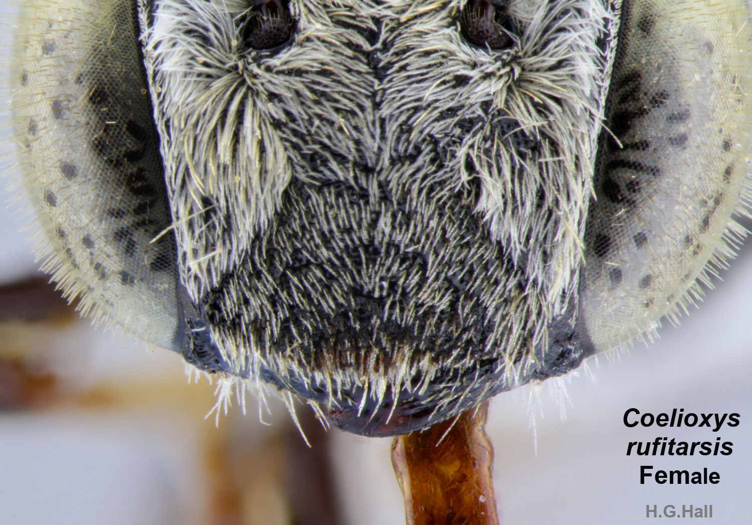 Ocular hairs long (about 0.15mm); tergum 6 with tiny setae ventral to angles which have a velvety appearance; tergum one with median fascia of long, slender erect setae....C. rufitarsis