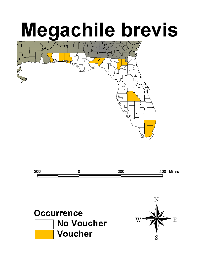 Notes: Variable in nesting habit. Both soil and stems used. Mitchell split out two subspecies, M. brevis brevis and a southeastern form Megachile brevis pseudobrevis, now considered separate species. Nearly all of our specimens conform to M. pseudobrevis.